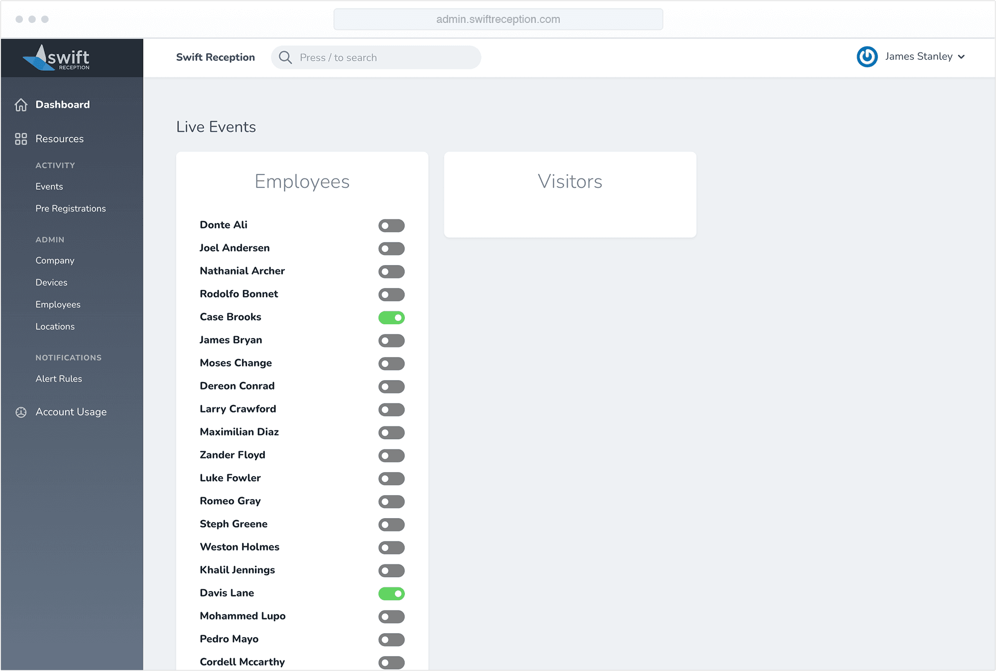 Each location can have a default sign out time usually at the end of the day. Visitors or employees who are still signed in will be automatically signed out.