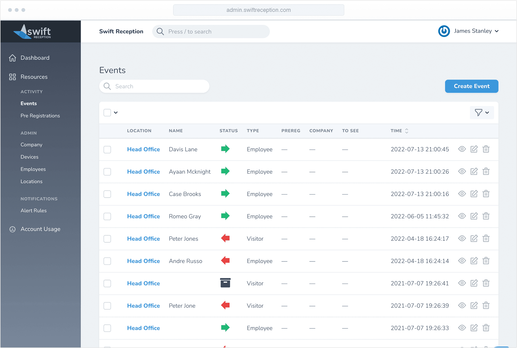 Separate sign in processes for employees, guests and deliveries allow a simple but effective entry process. No need to fill in date and time. The control panel will show how many employees are in, helping direct telephone calls.